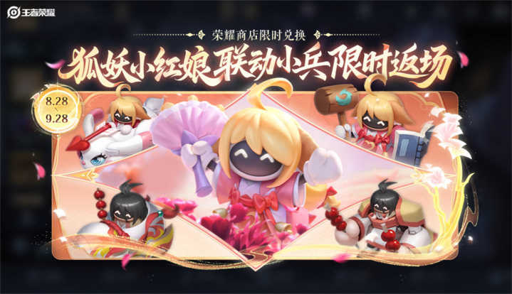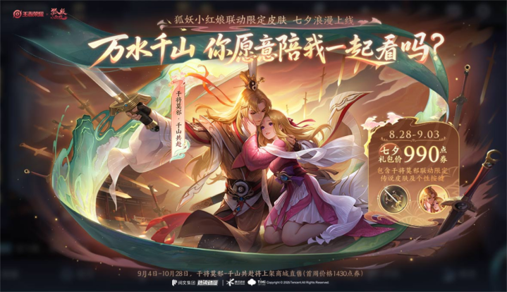 「千山共赴」是传说品质限定皮肤,标签为“狐妖小红娘”,上线时间为2025年8月28日至10月28日,首周礼包(含皮肤和个性按键)售价990点券,支持绑定点券购买,9月4日后恢复原价1788点券。
