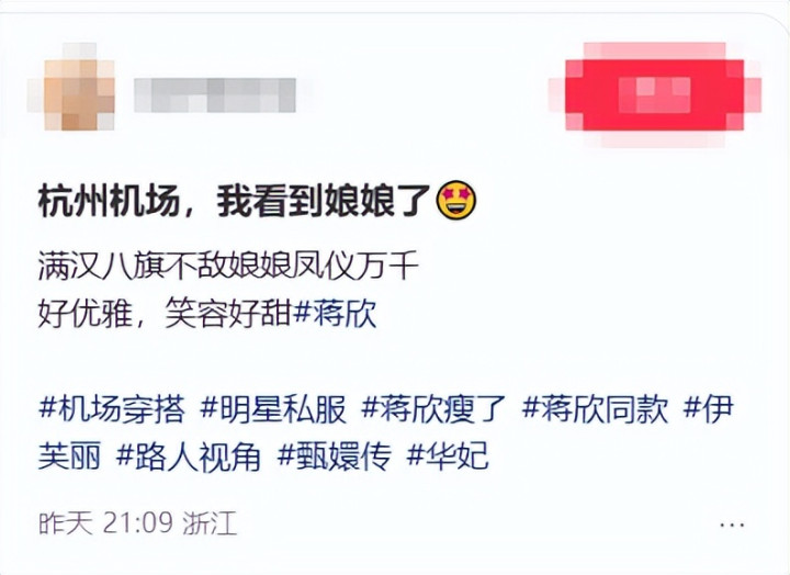 网友在杭州的机场看到了蒋欣,激动的不能行,忍不住的直呼: