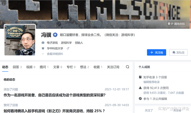像是《黑神话:悟空》的制作人冯骥,早年便活跃于知乎上,除了关注并回答自家游戏相关的问题外,从“如何看待腾讯入股手机游戏《影之刃》开发商灵游坊,持股25%?”,到“如何评价游戏《仙剑奇侠传 1》?”,各类深度游戏问答下都有他的身影。