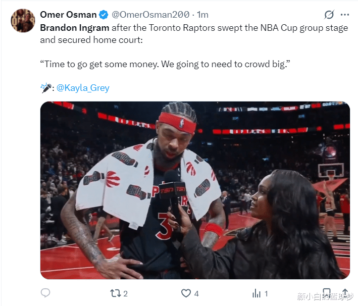 赛后英格拉姆接受采访谈到晋级杯赛八强,孩子是一个性情中人,他直言:我们已经赢得了一大笔钱,现在我们要去赢得更多的钱。(杯赛奖金)