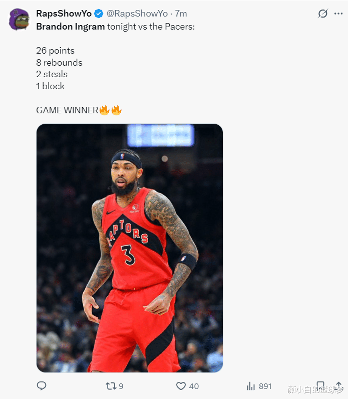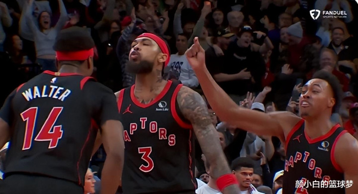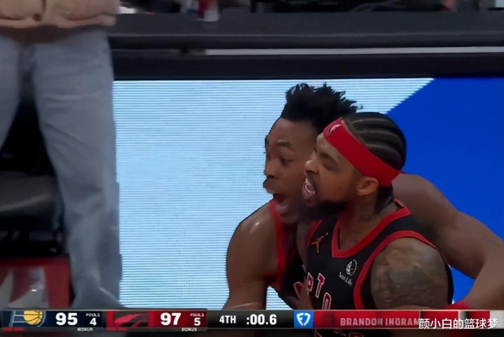 英格拉姆完成这个0.6秒中投准绝杀后表情那叫一个嚣张,斯科蒂-巴恩斯也也在一旁怒吼庆祝,这个准绝杀后猛龙已经豪取9连胜。